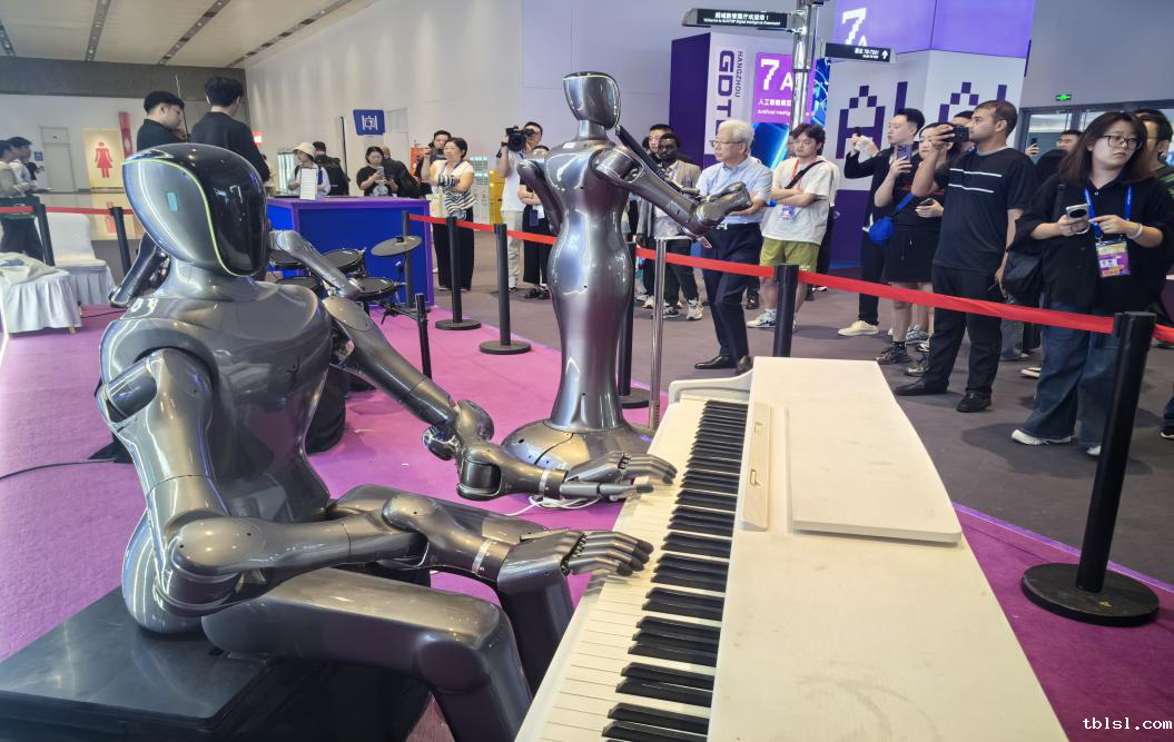 展会现场,机器人演奏乐器成为焦点。(摄影:赛娜)