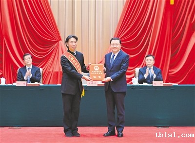 十一月二十七日,自治区党委书记王伟中为科学技术进步特等奖第一完成人张鹏举颁奖。 本报记者 马建兵 摄